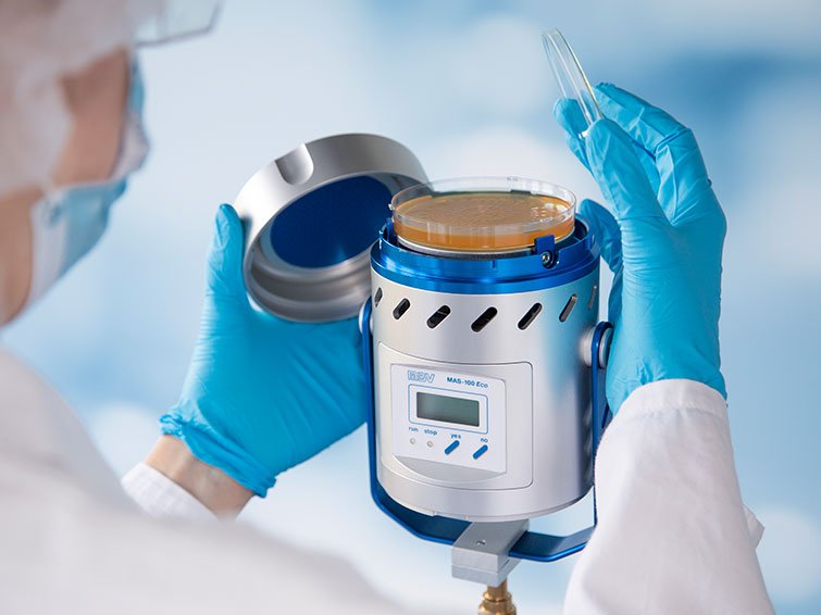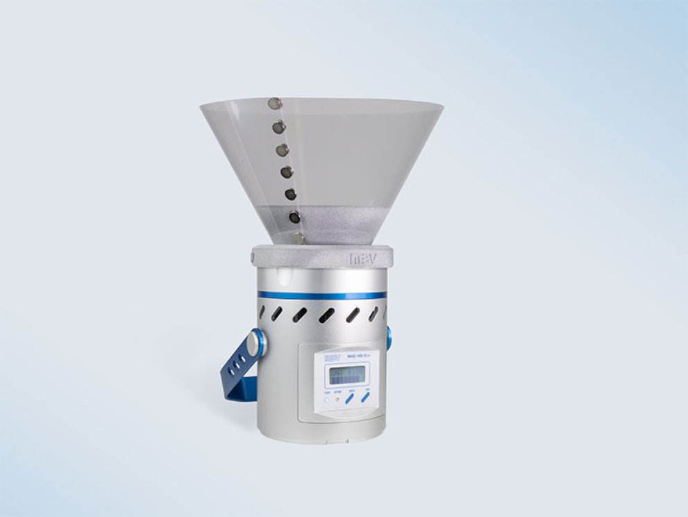 For active microbial air sampling based on the impaction principle, a predefined volume of air is drawn through a perforated sieve. The air and the particles in it are accelerated and directed onto an agar plate positioned below the sieve.